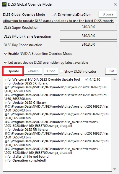 같은 폴더에 위 3개의 dll 파일(또는 하단에 링크)을 넣고 nvidiaDlssGlom.exe 을 실행 후 Update 클릭.