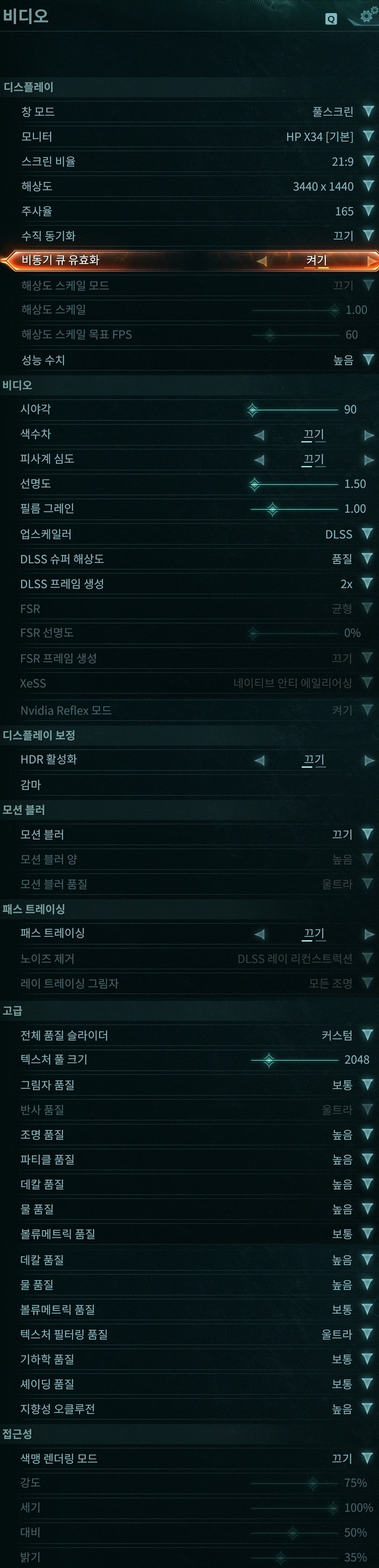 인게임에서 수직 동기화는 끄고 Nvidia 제어판에서 최대 프레임 제한 설정함