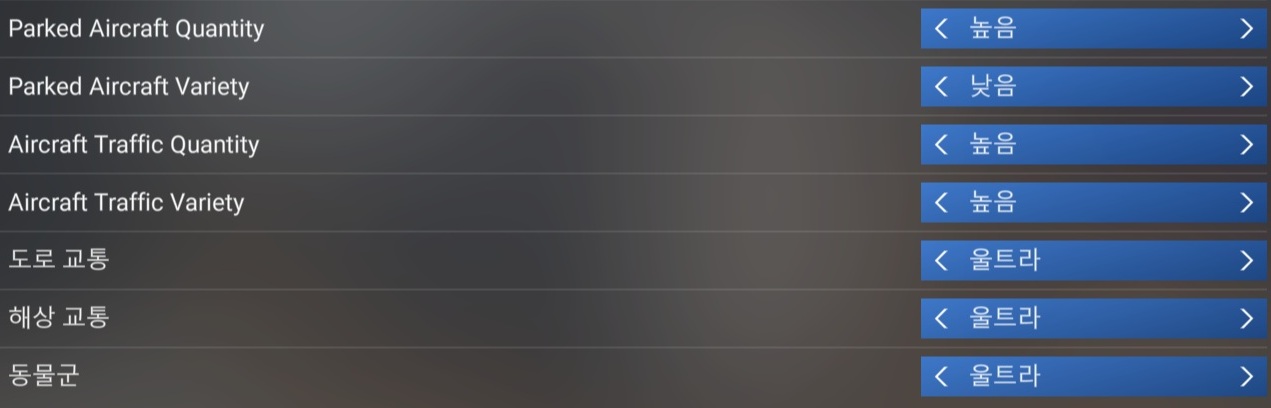 높게 설정하면: 주변 공역에 더 많은 AI 항공기들이 비행하며, 관제탑과의 교신도 더 빈번해짐