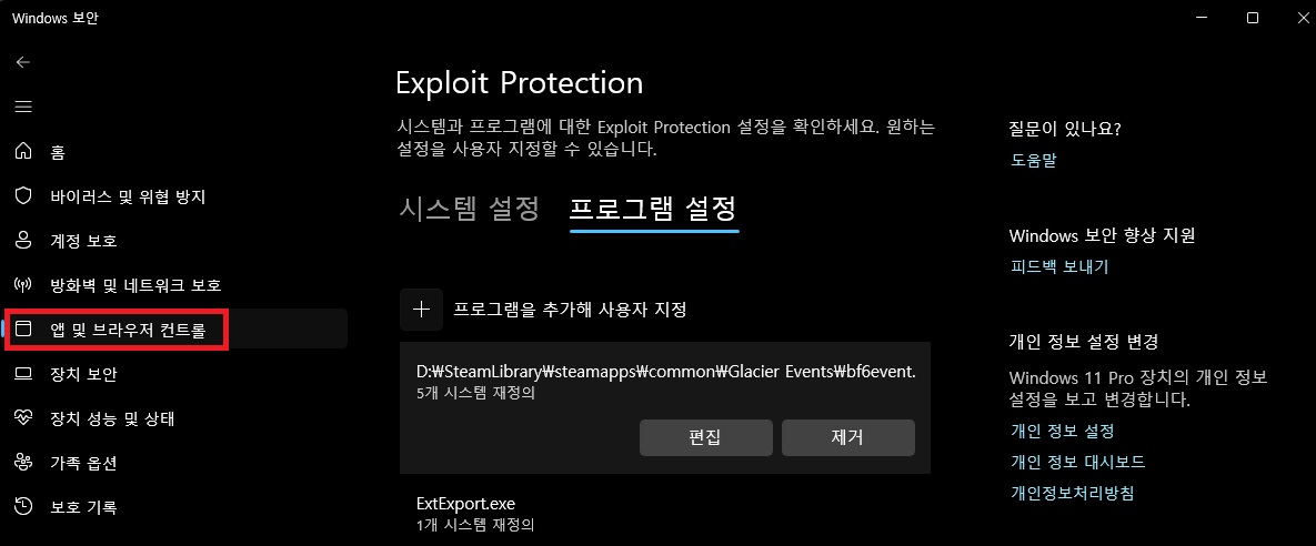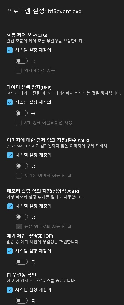 Windows 보안 > 앱 및 브라우저 컨트롤 > Exploit Protection > Exploit Protection 설정 > 프로그램 설정 > + 프로그램을 추가해 사용자 지정 > 정확한 파일 경로 선택 > \SteamLibrary\steamapps\common\Battlefield 6\bf6.exe 선택 후 아래와 같이 설정