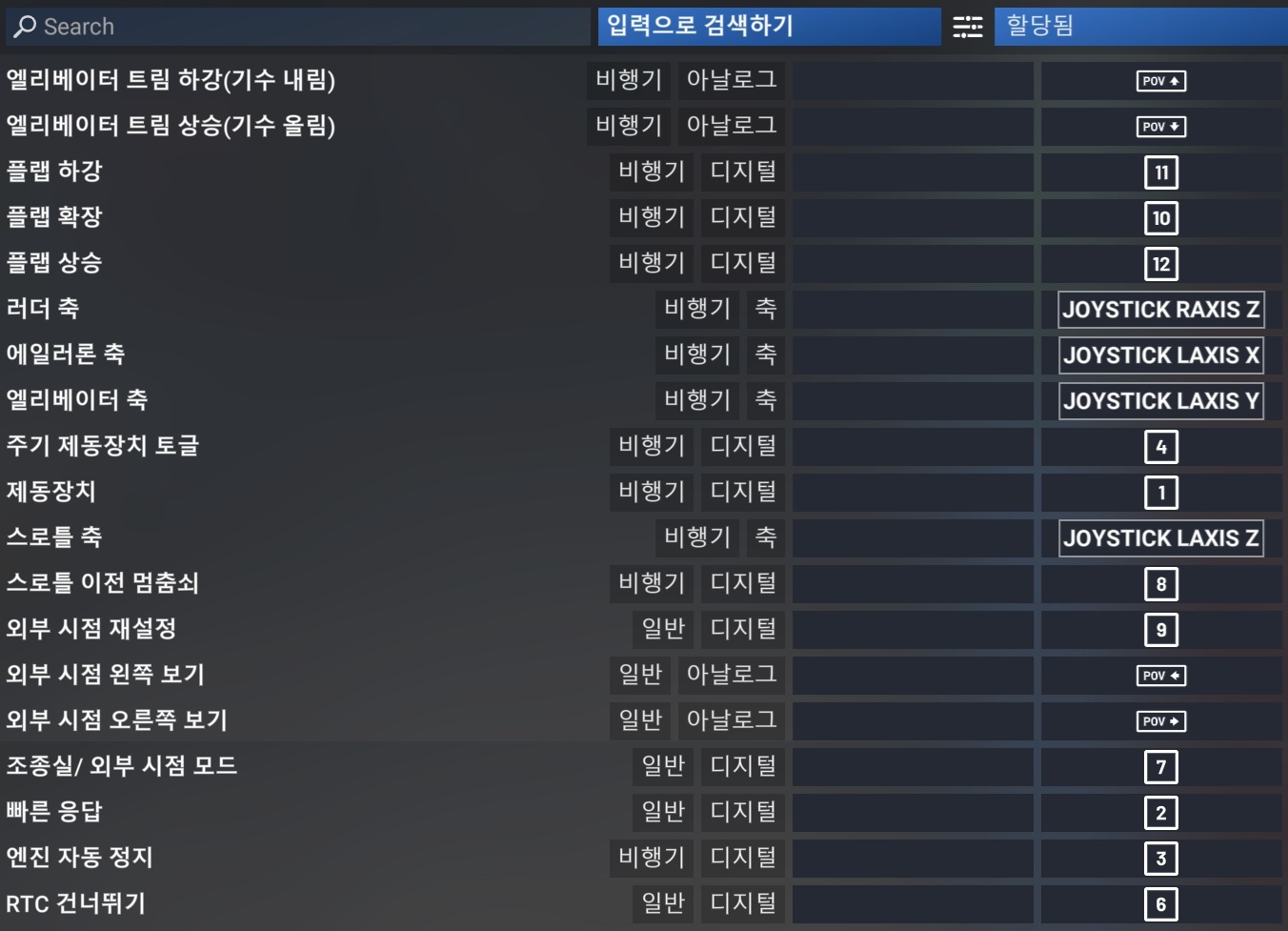 (수정할 땐 백스페이스 키)1. '에일러론 축 / AILERONS AXIS' 입력 후 조이스틱을 천천히 왼쪽으로 끝까지 기울임.