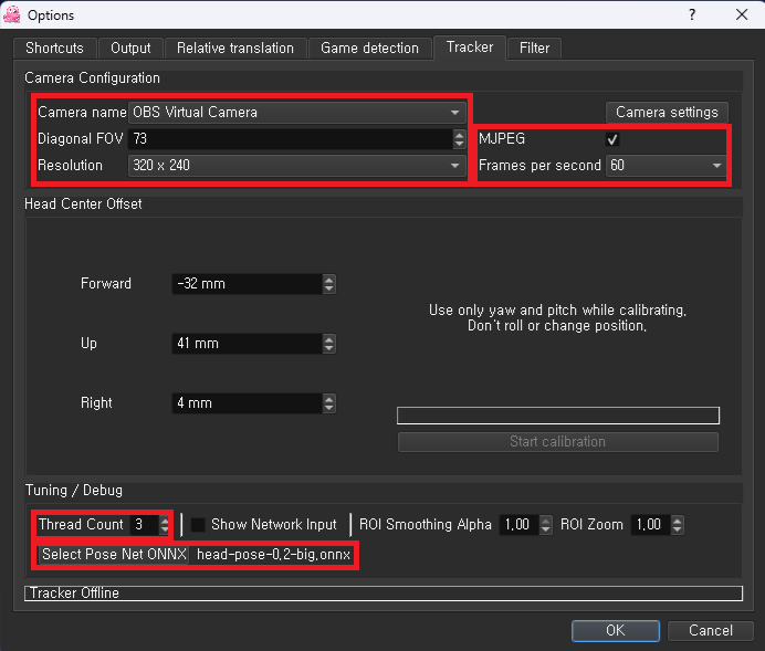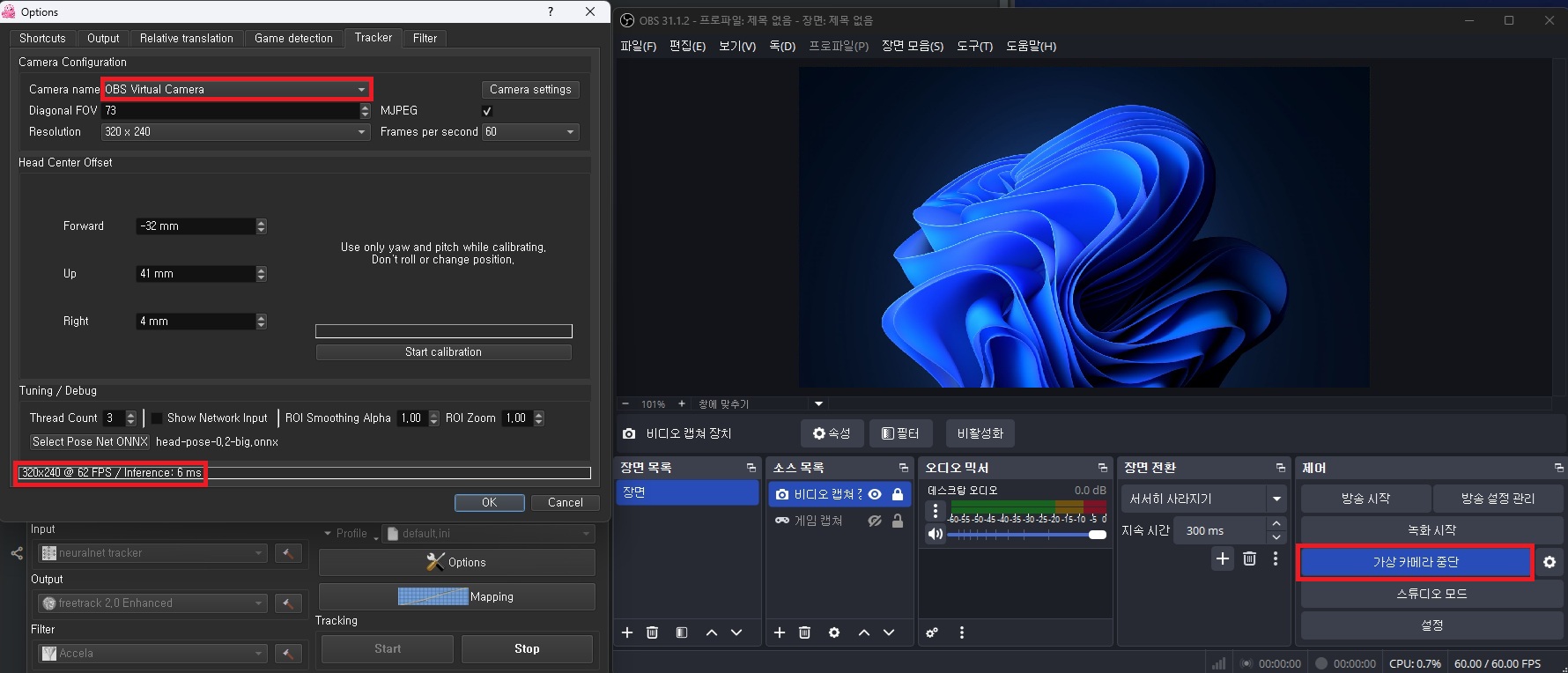 4K 30프레임, FHD 60프레임이 되는 웹캠인데 실내 조명을 최대한 밝게 하고 얼굴 앞에 조명을 놓고 사용해도 opentrack에서 60프레임이 되질 않음.(다른 프로그램들은 60프레임 작동)