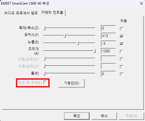 다른 웹캠들은 저조도 보정(Low Light Compensation)을 끄면 된다고 하는데 그 옵션이 비활성화 상태임.
