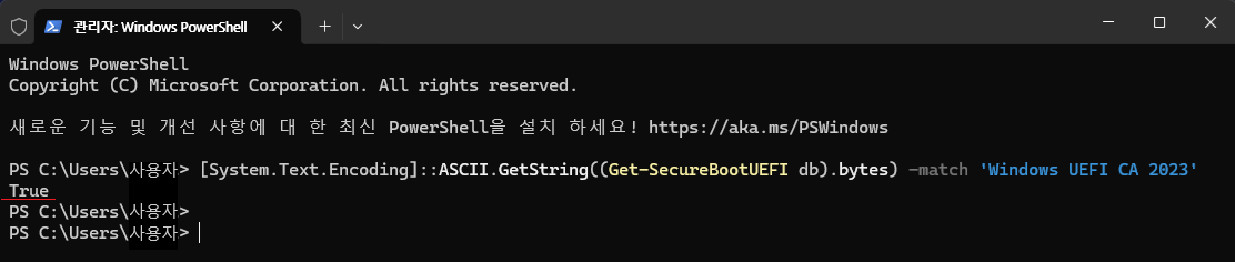 [System.Text.Encoding]::ASCII.GetString((Get-SecureBootUEFI db).bytes) -match 'Windows UEFI CA 2023' - 결과 확인