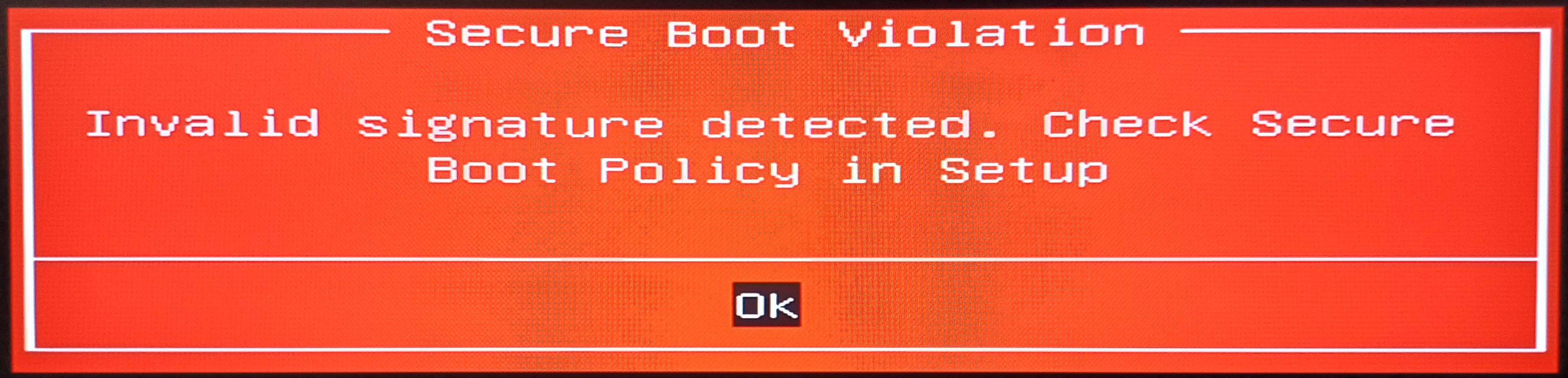- PC는 이 USB의 부팅 파일을 "신뢰할 수 없는 파일"로 간주하여 보안 부팅 오류를 일으키며 부팅을 막아버립니다.