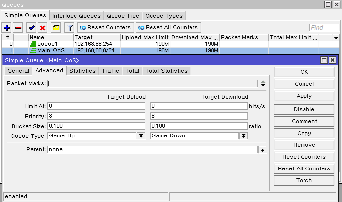 - 만약 CPU가 100%를 찍으며 인터넷이 버벅인다면, Simple Queue의 Max Limit를 180M 정도로 낮게 설정.