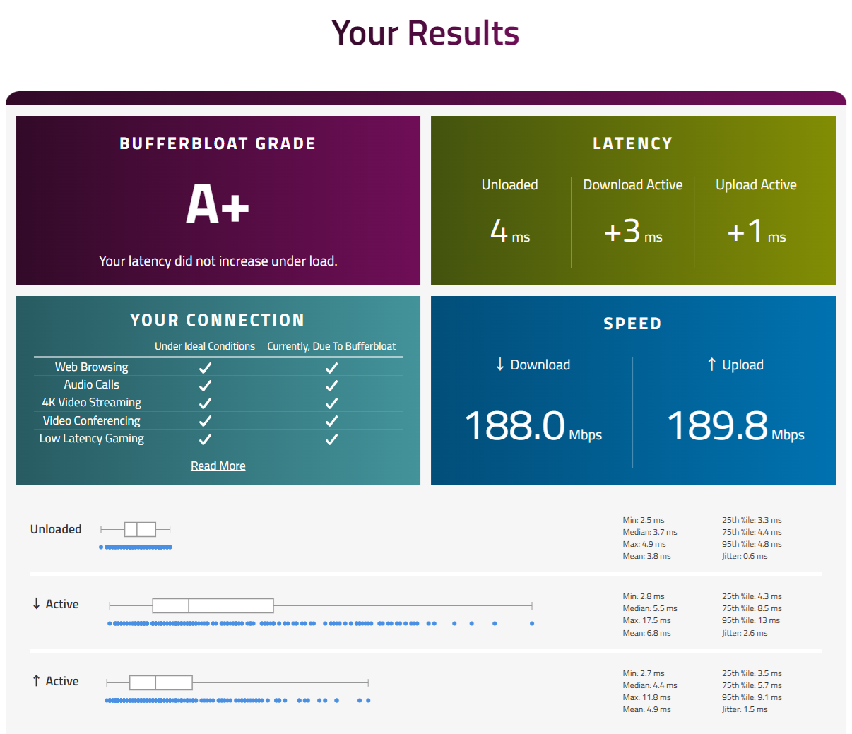 설정 적용 후 Bufferbloat and Internet Speed Test 페이지 중간에 Start Test를 클릭해서 A+ 또는 A등급이 나오는지 확인할 것.